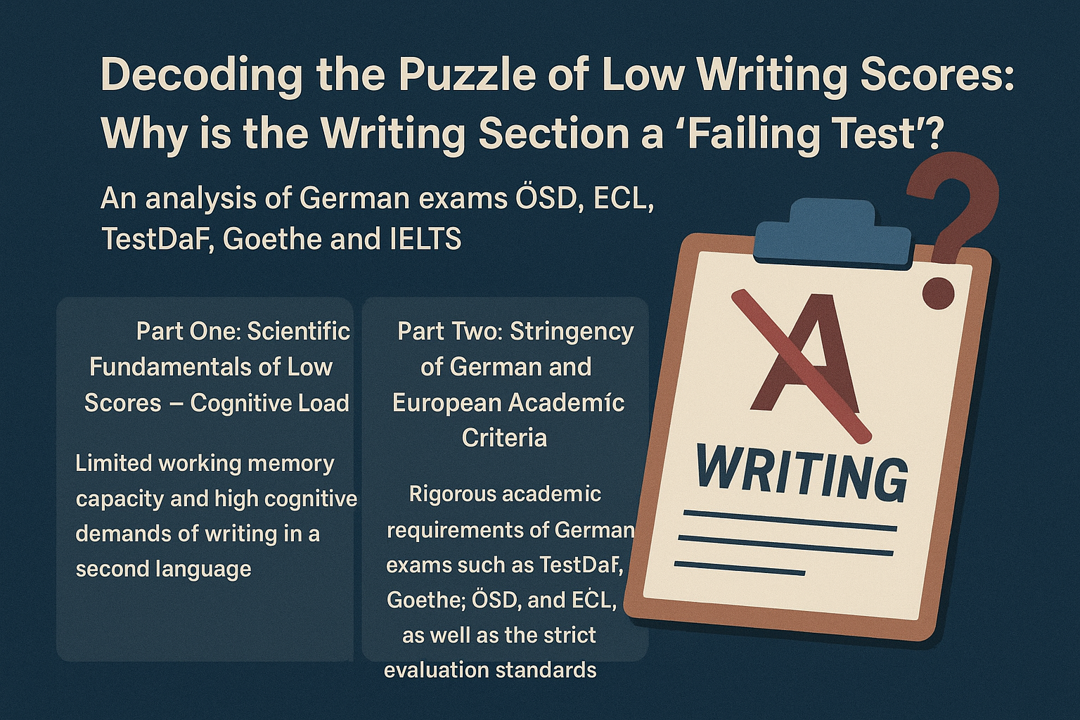چرا نمره بخش نوشتاری پایین است. این مقاله بهصورت علمی و روانزبانشناختی دلایل افت نمره در بخش رایتینگ آزمونهای بینالمللی بهویژه ECL، TestDaF،ÖSD، Goethe و IELTS را بررسی میکند. نویسنده توضیح میدهد که چرا نوشتن در زبان دوم بهدلیل بار شناختی بالا، تداخل ساختار فارسی (SOV) با ساختارهای آلمانی و انگلیسی، و معیارهای تحلیلی و سختگیرانه آزمونهایی مانند ECL , ÖSD دشوارتر از سایر مهارتهاست. در پایان، مقاله بر لزوم آموزش هدفمند و تمرین تقابلی برای رفع خطاهای فسیلشده و دستیابی به نمره مطلوب در رایتینگ ECL و سایر آزمونها تأکید میکند. رمزگشایی نمرات پایین رایتینگ آیلتس و آلمانی (Goethe، TestDaF، ECL) رمزگشایی نمرات پایین رایتینگ: چرا بخش نوشتار، «آزمون شکست» است؟ (تحلیلی بر آزمونهای آلمانی ÖSD، ECL، TestDaF، Goethe و IELTS) منتشر شده در: ۱۳ آبان ۱۴۰۴ منبع: واحد پژوهش های تخصصی سپانو تحلیلی علمی بر ریشههای نمرات پایین رایتینگ در آزمونهای بینالمللی مشاهدهای جهانی و در عین حال دردناک در میان زبانآموزان، بهویژه در آزمونهای سطح بالا مانند ECL، TestDaF، ÖSD، Goethe و IELTS، یکسان است: نمره بخش نوشتار (Writing) معمولاً پایینتر از سایر مهارتهاست. این مسئله ریشه در اصول روانزبانشناسی، محدودیتهای شناختی و ماهیت پیچیده تولید نوشتار در زبان دوم (L2) دارد. مقاله حاضر با تکیه بر تئوریهای بار شناختی و تحلیل تقابلی زبان فارسی و آلمانی، توضیح میدهد چرا رایتینگ به «آزمون شکست» تبدیل شده و فارسیزبانان در آزمونهای آلمانی و بهویژه ECL با چالشهای ساختاری و بلاغی عمیق مواجهاند. بخش اول: مبانی علمی نمرات پایین — بار شناختی (Cognitive Load) دلیل اصلی افت نمره در رایتینگ، ظرفیت محدود حافظه کاری (Working Memory) است. تولید نوشتار در زبان دوم یک فعالیت با بار شناختی بالا محسوب میشود، زیرا نیازمند هماهنگی همزمان تفکر، ساختار و واژگان است. ۱.۱. تفاوت درک و تولید: کنترل درکی در برابر کنترل تولیدی مهارتهای درکی (Receptive) مانند خواندن و شنیدن سریعتر از مهارتهای تولیدی (Productive) مانند نوشتن رشد میکنند. رایتینگ نیازمند کنترل فعال و دقیق زبان، سازماندهی ایده و کاربرد درست ساختارهاست. ۱.۲. تئوری بار شناختی در عمل بار ذاتی (Intrinsic Load): مدیریت همزمان ایدهها، واژگان، نحو و انسجام متن. بار خارجی (Extraneous Load): ناشی از ترجمه ذهنی از فارسی به زبان هدف که ساختار را دچار آشفتگی میکند. بار مرتبط (Germane Load): فشار ذهنی برای دستیابی به سبک و بلاغت آکادمیک. بخش دوم: سختگیری معیارهای آکادمیک آلمانی و اروپایی آزمونهای آلمانی مانند TestDaF، Goethe، ÖSD و آزمون اروپایی ECL همگی نقش «نگهبانان آکادمیک» را دارند. این آزمونها نهتنها زبان، بلکه توانایی استدلال، انسجام و دقت ساختاری را میسنجند. ۲.۱. دقت آکادمیک و سیستم جریمه در Goethe و TestDaF آزمونهای Goethe و TestDaF به داوطلب نیاز دارند تا زبان آکادمیک را با استدلال منطقی، واژگان رسمی و گرامر دقیق بهکار گیرد. وجود حتی چند خطای سیستماتیک، نمره را بهسرعت کاهش میدهد. ۲.۲. ارزیابی تحلیلی در ECL و ÖSD آزمونهای ECL و ÖSD از رویکرد تحلیلی استفاده میکنند. در این شیوه، نمره نهایی حاصل جمع معیارهایی چون دقت، انسجام، واژگان، سبک و اثربخشی ارتباطی است. این ساختار دقیق، نقاط ضعف را شفافتر از سایر آزمونها نشان میدهد. ۲.۳. ویژگیها و چالشهای خاص رایتینگ در ECL آزمون ECL بخش نوشتار را تحت عنوان «ارتباط نوشتاری» ارزیابی میکند. در هر سطح، داوطلب دو تکلیف نوشتاری دارد که باید در زمان مشخص (براساس سطح CEFR) و در محدودهٔ واژه تعیینشده انجام دهد. سیستم نمرهدهی ECL تحلیلی است و بر پنج معیار مساوی استوار است: دقت شکلی یا فرمی (Morphology & Syntax)، دقت نوشتاری، واژگان، سبک و اثربخشی ارتباطی. هر معیار بین ۰ تا ۵ امتیاز دارد و دو ناظر مستقل آن را ارزیابی میکنند. ویژگی منحصربهفرد ECL، امکان استفاده از فرهنگلغت در برخی زبانهاست. این مزیت میتواند بخشی از بار شناختی را کاهش دهد، اما تنها زمانی مؤثر است که داوطلب بهجای ترجمه ذهنی، از دیکشنری برای بررس